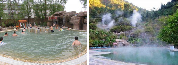 熱水溫泉地處老圖山脈東緣山麓,分布面積為0.42平公里,日最大可采儲量1800~2100噸,中心孔深503米,自流水溫高達當地沸點97℃,是全國水溫最高的溫泉之一。泉水中含有碳酸氯鈉、硫化氫、二氧化硅、氡、氟、碘、硼、銅、銀、鉀、鈦、鈄、鎂、鋰、鈣等卜幾種化學物質及微量元素,對神經衰弱、高血壓、糖尿病、皮膚病、胃病、布氏桿菌癇、多發性神經炎、增生性脊柱炎、氣管炎等30多種常見疾病有很好的療效和較強的保健作用。